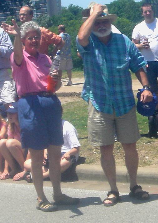 Bruiser and Grandpa watch the people looking at the cars