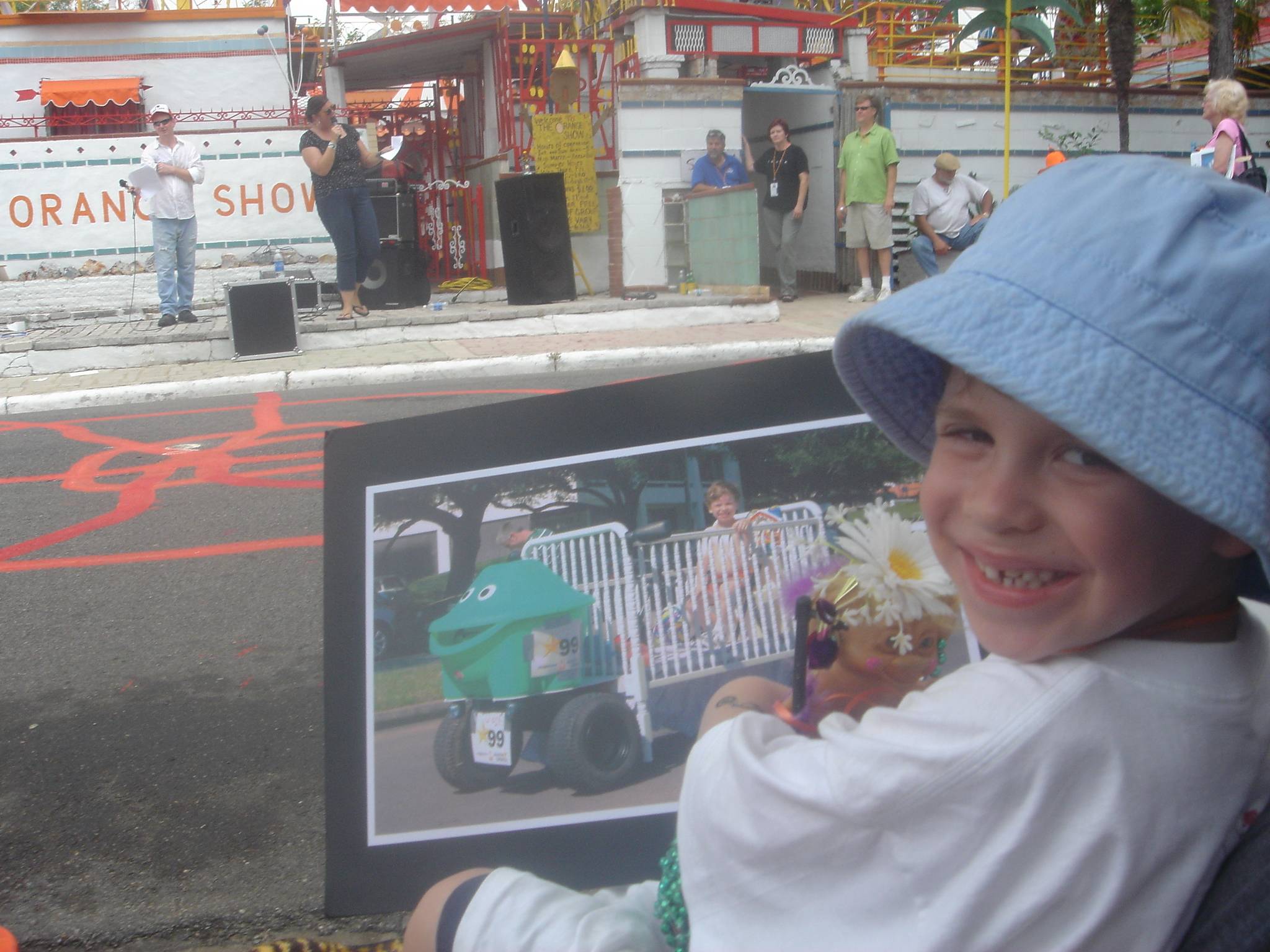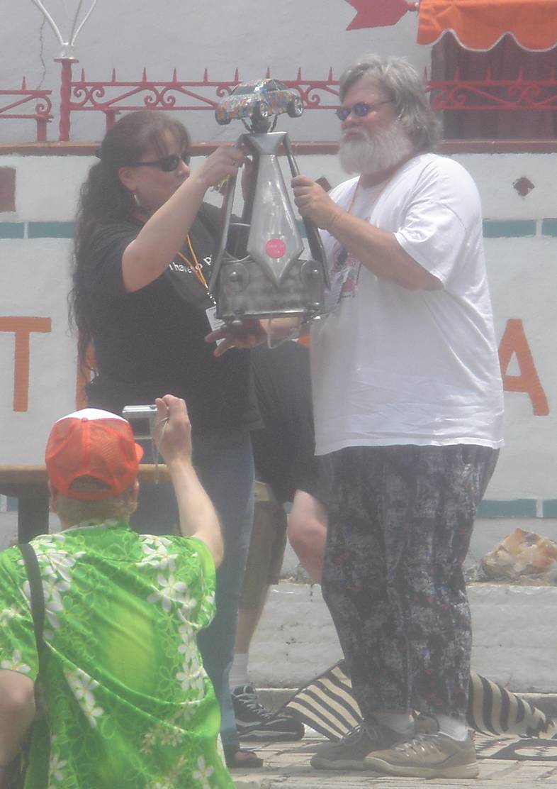 Despite the fact that he has had nothing to do with building or entering the car, Bruiser accepts the award for third place, youth group.