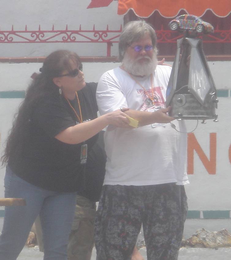 Despite the fact that he has had nothing to do with building or entering the car, Bruiser accepts the award for third place, youth group.
